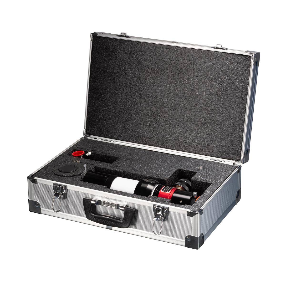 PT - Pressure-Tuner : le réglage fin du filtre étalon s'effectue par un système pneumatique. Une légère variation de la pression de l'air dans une chambre de pression à l'intérieur du télescope modifie l'indice de réfraction de l'air, ce qui permet d'obtenir sans effort un réglage précis sur la raie H-alpha. Le Pressure-Tuner garantit une image uniforme, sans obstruction centrale, et un filtre étalon durablement protégé sans usure.